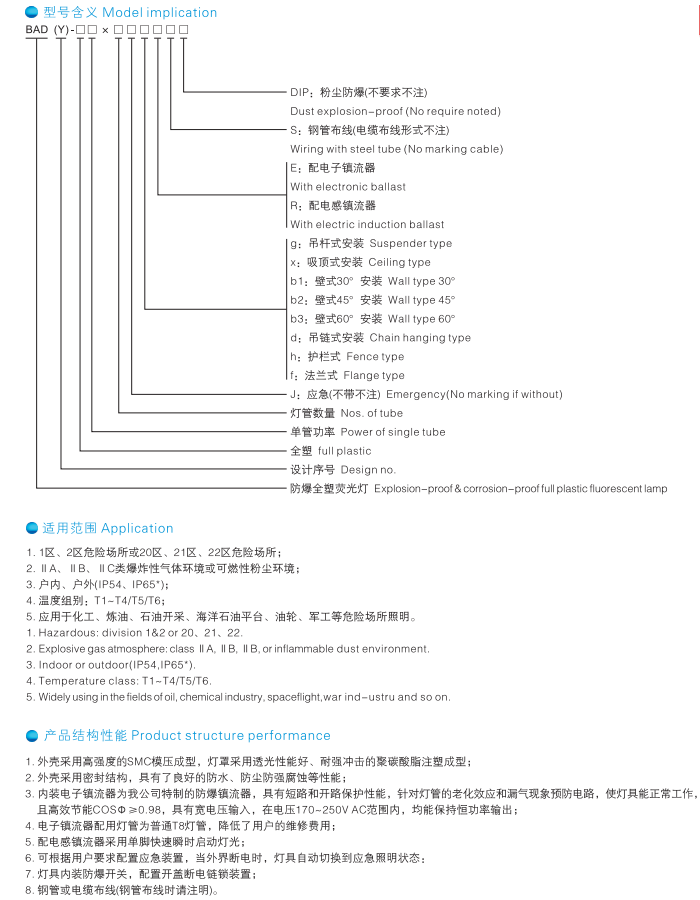 3.内装电子镇流器为我公司特制的防爆镇流器,具有断路和开路保护性能,针对灯管的老化效应和漏气现象预防电路,使灯具能正常工作,且节能COS∅≥0.98,具有宽电压输入,在电压170~250VAC范围内,均能保持恒功率输出。