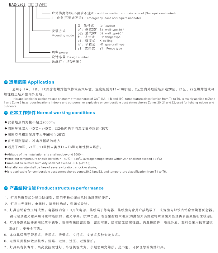 1.灯具防爆形式为粉尘防爆型,适用于粉尘爆炸危险场所照明使用,
