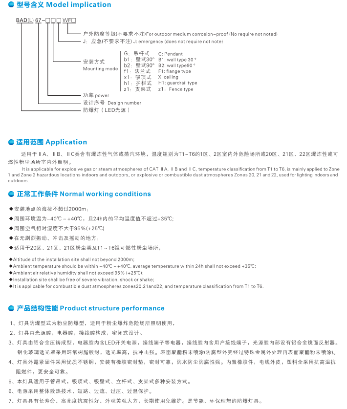 1.灯具防爆形式为粉尘防爆型,适用于粉尘爆炸危险场所照明使用,