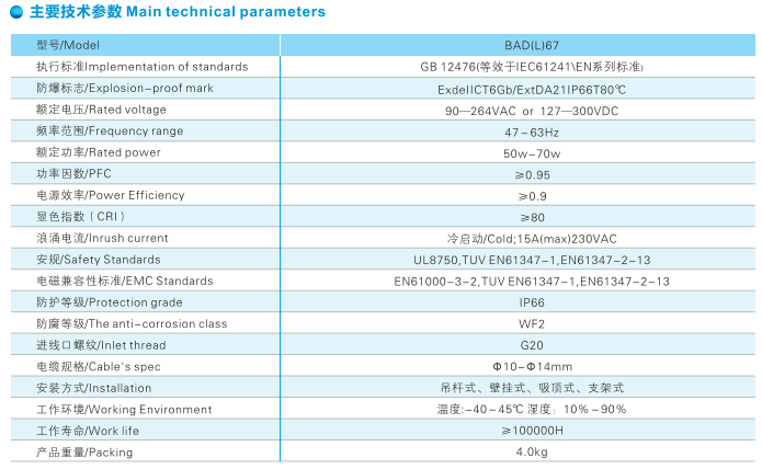 5.本灯具寿命长,高亮度抗震性能好,外形美观大方。是节能,环保理想的防爆灯具。