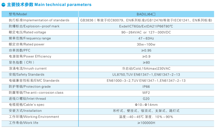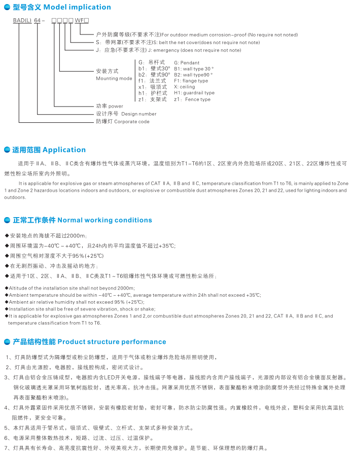 1.灯具防爆形式为隔爆型或粉尘防爆型,适用于气体或粉尘爆炸危险场所照明使用,