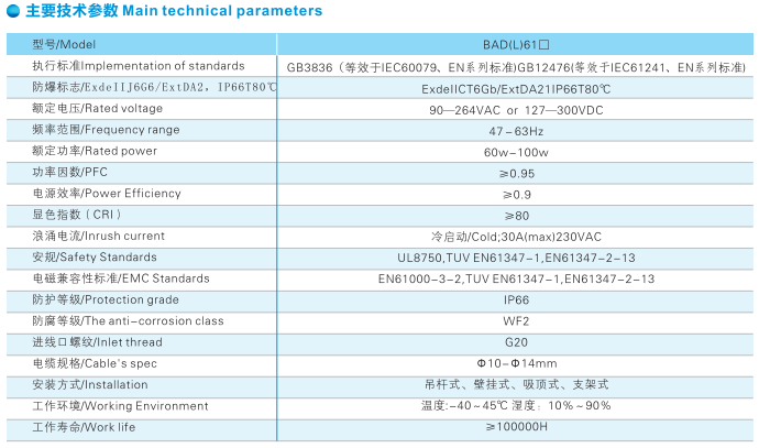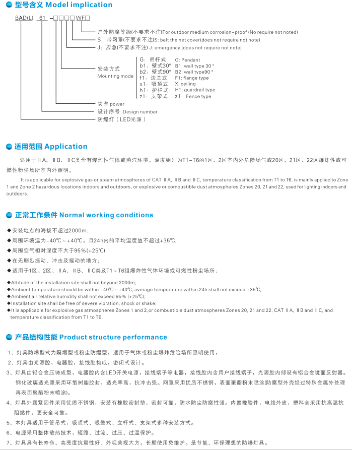 1.灯具防爆形式为隔爆型或粉尘防爆型,适用于气体或粉尘爆炸危险场所照明使用,