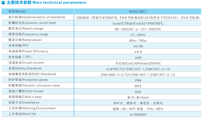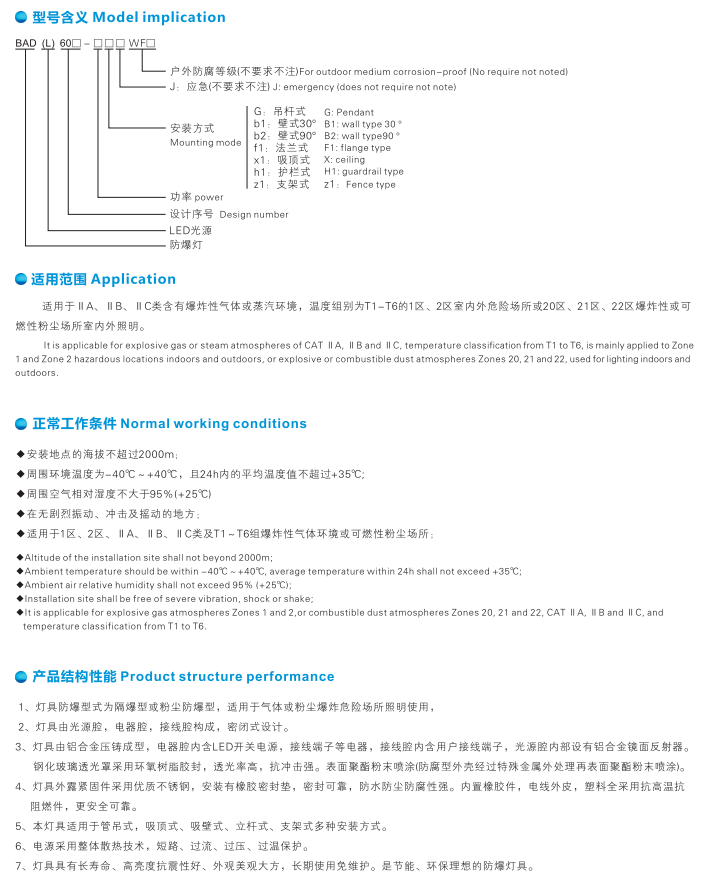 1.灯具防爆形式为隔爆型或粉尘防爆型,适用于气体或粉尘爆炸危险场所照明使用,