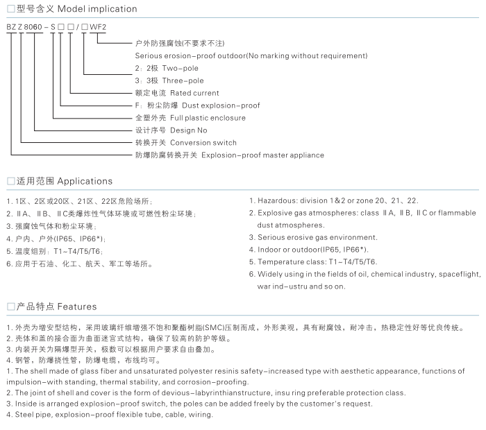 1.外壳为增安型结构,采用玻璃纤维增强不饱和聚酯树脂压制而成,外形美观,具有耐腐蚀,耐冲击,热稳定性好等优点。