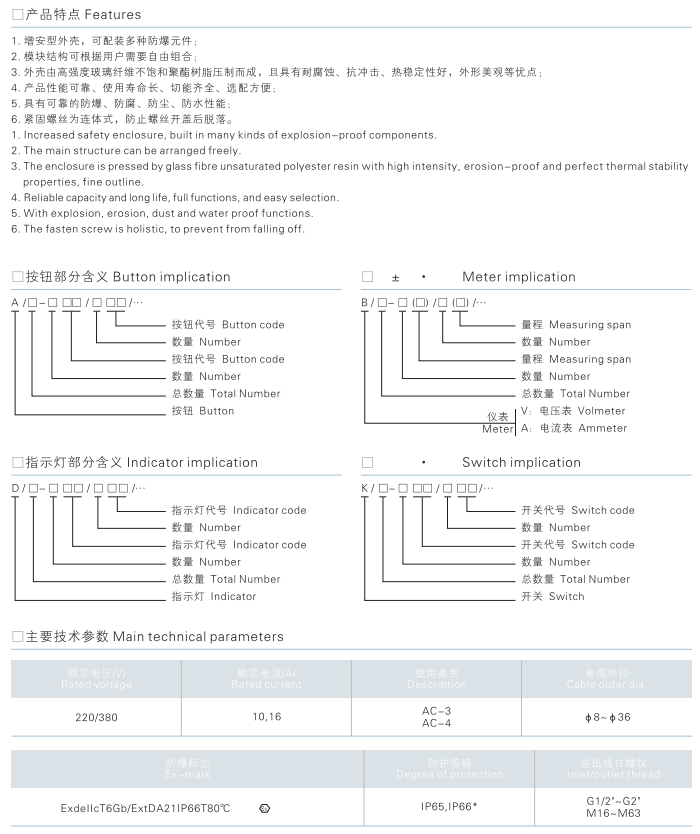 1.增安型外壳,可配装多种防爆元件。