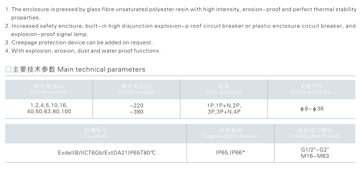 2.增安型外壳,内装防爆高分断小型断路器或塑壳式断路器,防爆信号等。