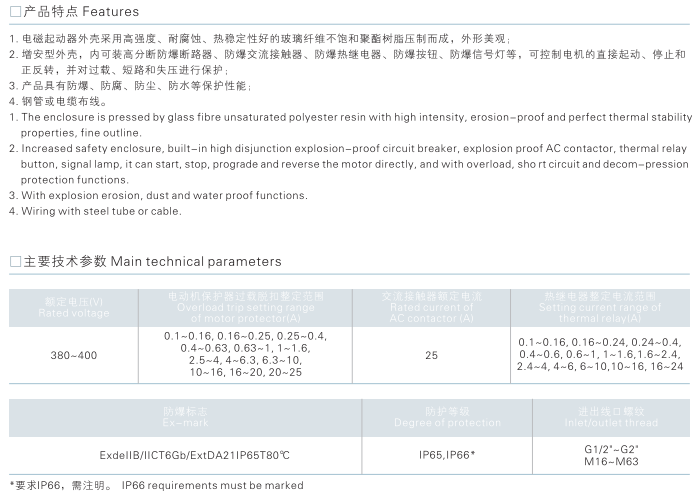 2.增安型外壳,内装高分断防爆断路器,防爆交流接触器,防爆热继,防爆按钮,防爆信号灯,可控制电机的直接启动,停止和正反转,并对过载,短路和失压进行保护。