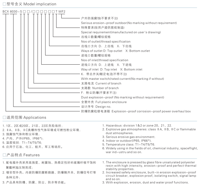 2.增安型外壳,内装防爆防腐断路器,防爆电动机保护开关,防爆电涌保护器,隔离开关等各种元件。