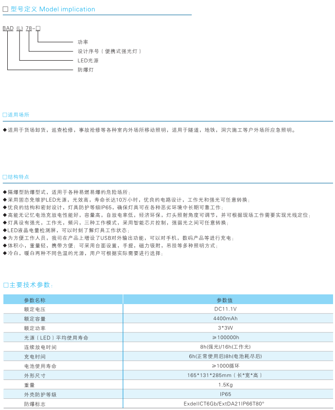 4.高能无记忆电池充放电性能好,容量高,自放电率低,经济环保,灯头照射角度可调节,并根据现场工作需要实现光线定位。