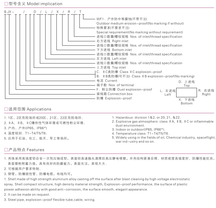 1.壳体采用高强度铝合金一次性压铸成型,表面高速抛丸处理,高压静电喷塑。外壳结构紧凑,材质密度好,强度好,防爆性能优良,表面塑粉附着力强具有良好的防腐能力,表面光洁,美观大方。