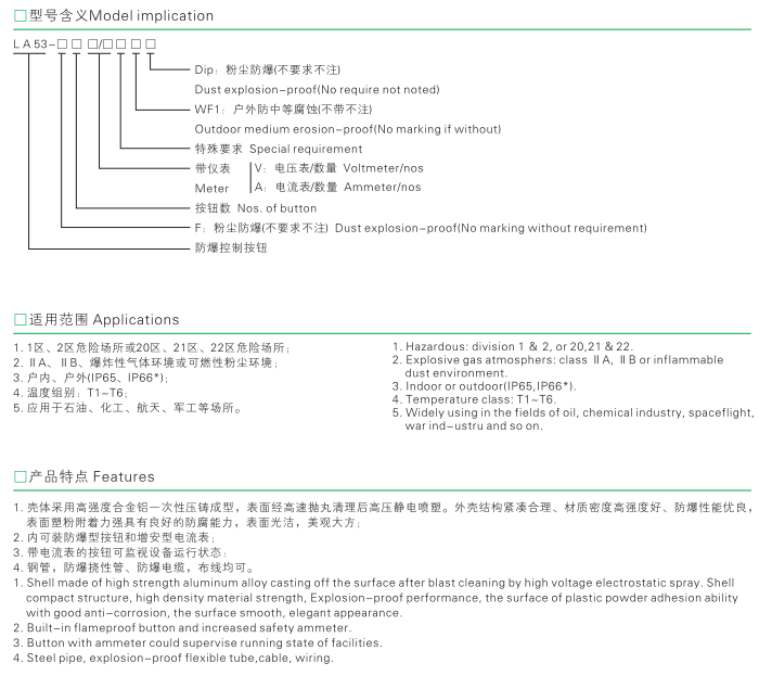 1.壳体采用高强度铝合金压制成型,表面高速抛丸处理后静电喷塑。外壳结构紧实,材质密度高强度好,防爆性能优良。表面塑粉附着力强具有良好的防腐能力,表面光洁,美观大方。