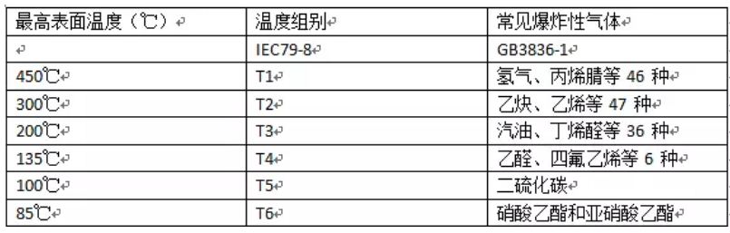 这是与气体点燃温度有关的电气设备(假定环境温度为40℃时)的最高表面温度,点燃能量与点燃温度无关。在标准BS5345第一部分中列出了所有可燃性气体和其组别。