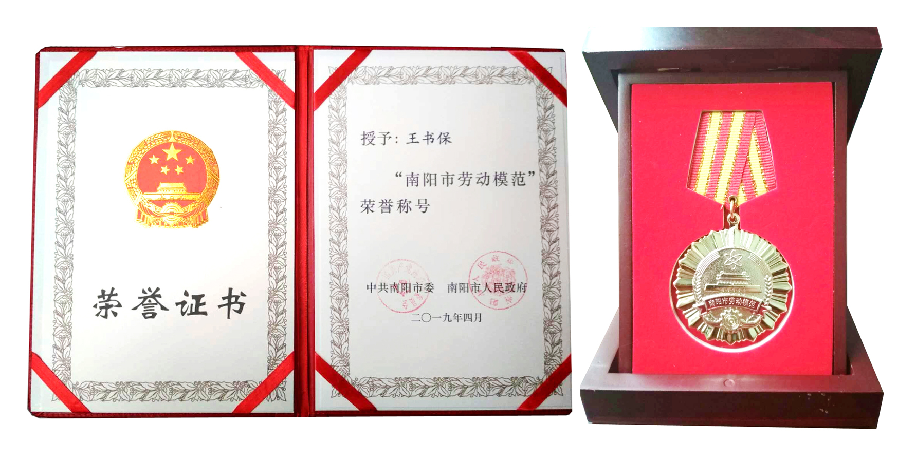 南阳市委、市政府授予王书保“南阳市劳动模范”荣誉证书