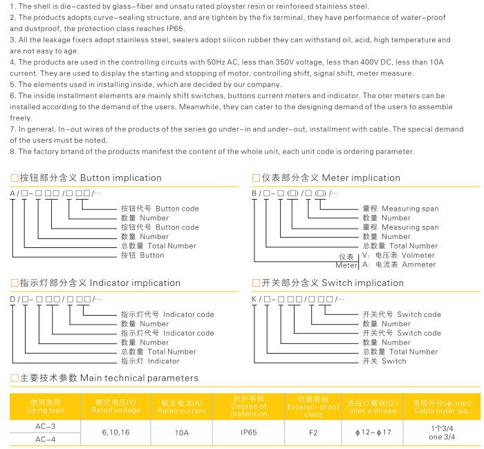 3.本系列产品可作为工作现场电动机的启停,控制转换,信号切换,仪表计量显示等之用。