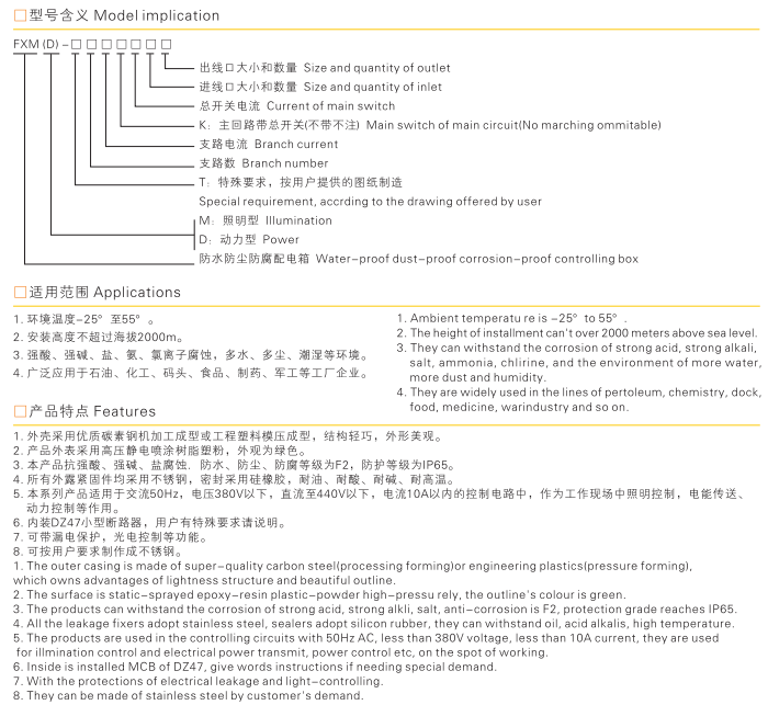 5.本系列产品适用于交流50HZ,电压380V以下,直流至440V以下,电流10A以内的控制电路中,作为工作现场中照明控制,电能传送,动力控制等作用。